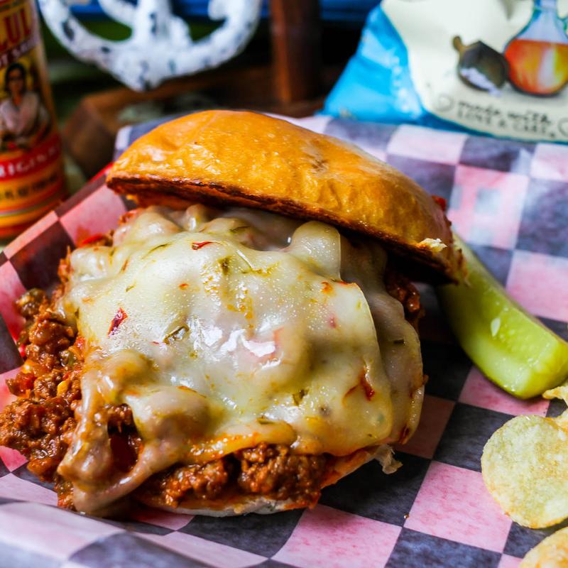 Saucy Tomatoed Old School Ground Beef, Peppers, Onions. Served w/ Slice of Monterey Jack Jalapeño Cheese on Pan de Mei