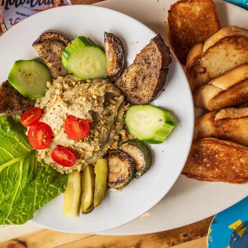 Featuring Rukkah - Pistachio, Pecan, Macadamia + Toasted Fennel Topping. Roasted Eggplant, Roasted Zucchini, Tomato, Lettuce + Pickle w/ Baguette
